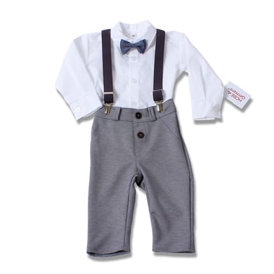 Product details: 4-delige set voor doop Pantalon in grijs Bretels in donkergrijs Overhemd in wit met lange mouwen Strikje in donkerblauw Materiaal en verzorging: Materiaal: 80% katoen, 20% polyester Niet geschikt voor droger Wasbaar op 40°C